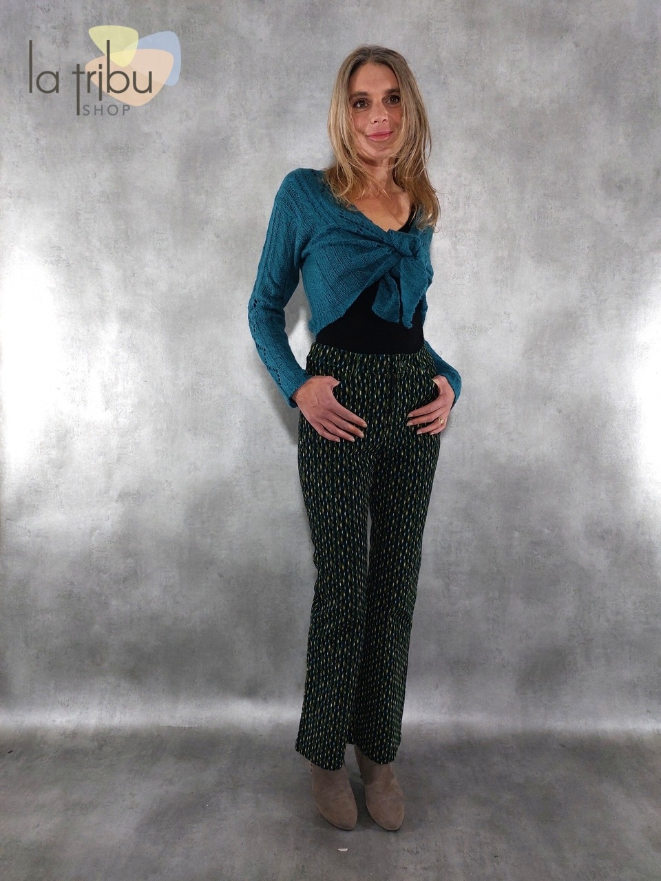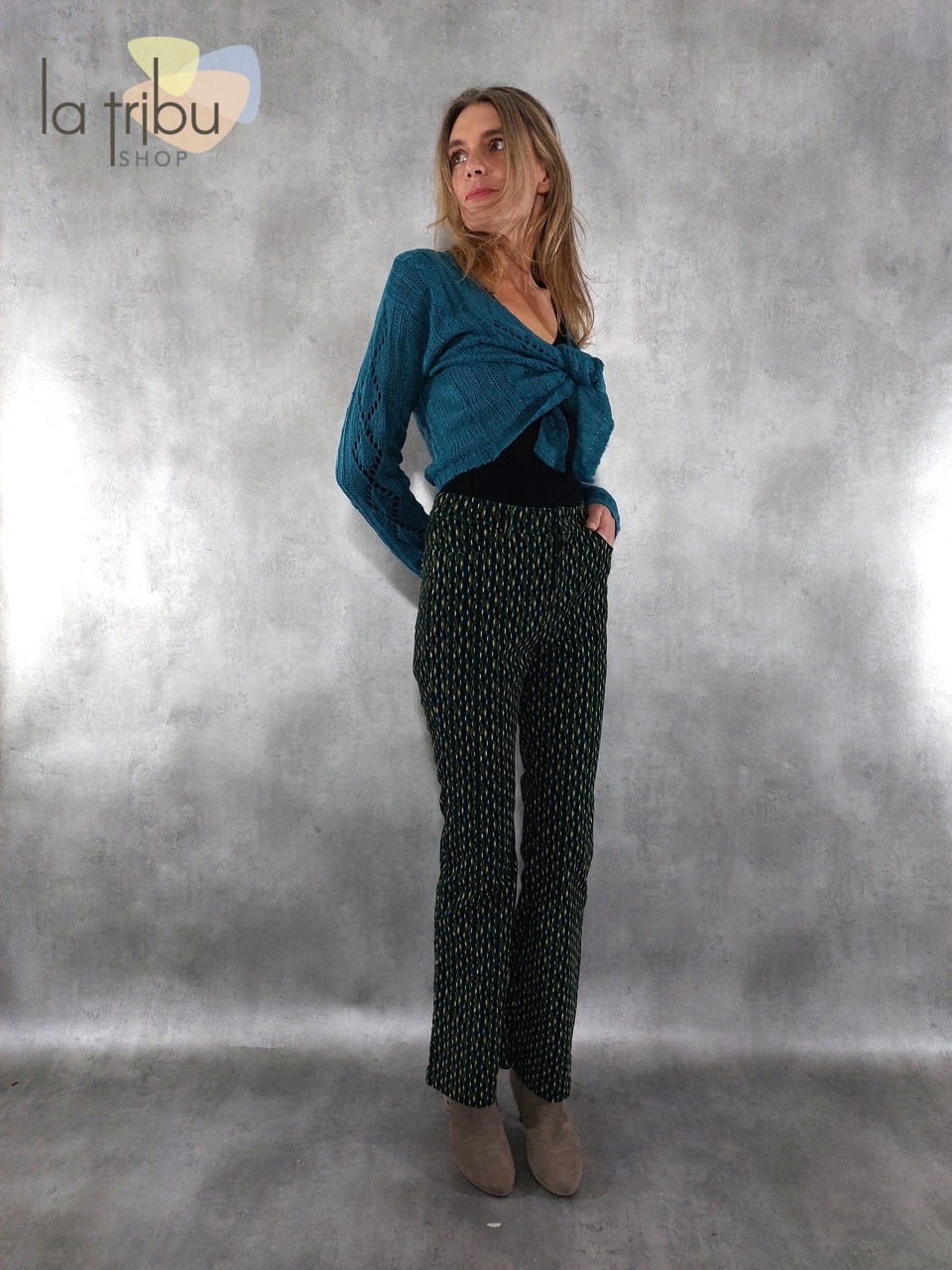 Le maillage de ce coton donne un tombé structuré, on aime la coupe ultra seventies, la surpiqure de la ceinture et les essentielles 4 poches de ce super pantalon